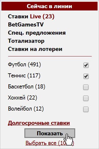 Для того чтобы сделать ставку Экспресс, нужно сначала выбрать вид(-ы) спорта из списка в левой части экрана, отметить их галочкой справа