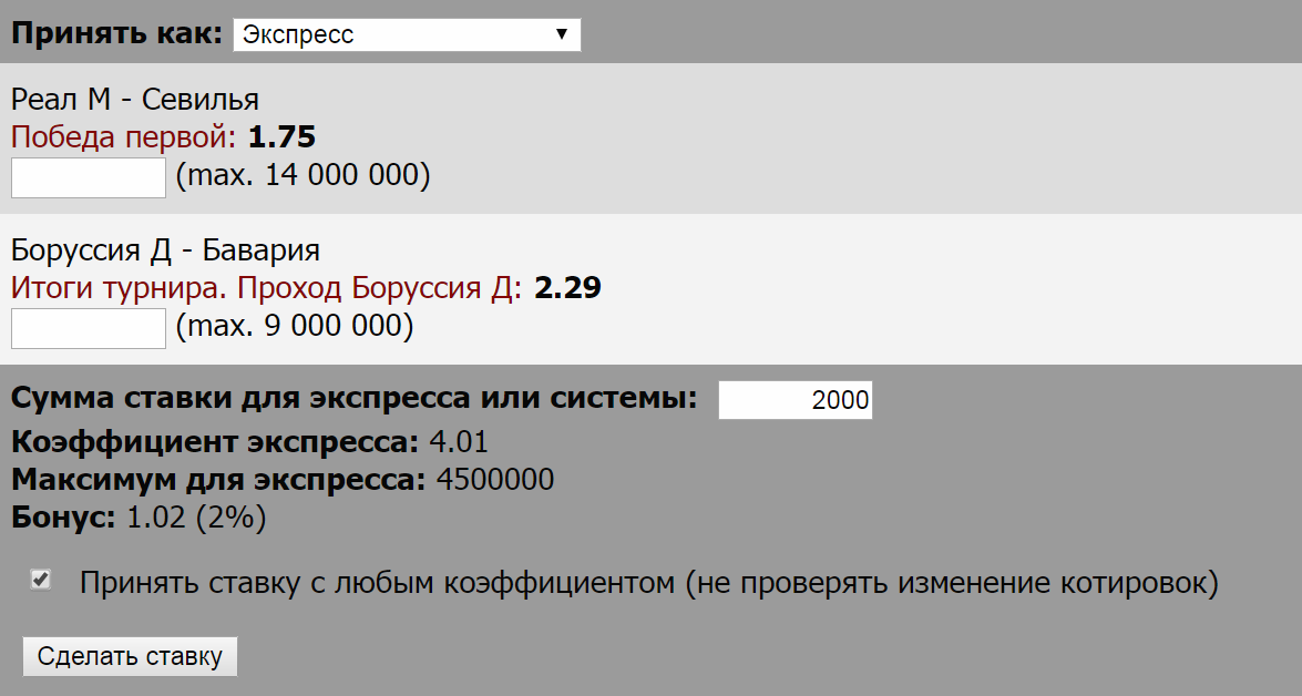 В корзине необходимо выбрать поле "Принять ставку как экспресс" , ввести сумму ставки и нажать «Сделать ставку» для завершения.