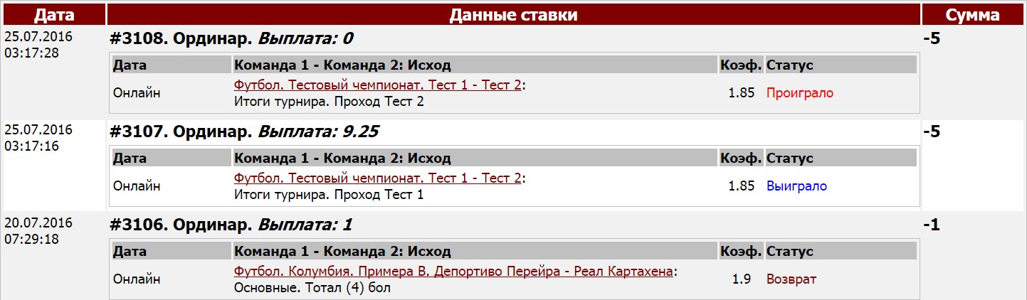 Вся история логина, включая рассчитанные ставки и транзакции, архивируется, ввиду чего для просмотра доступны только действия за последний месяц, а также нерассчитанные ставки любой давности.
