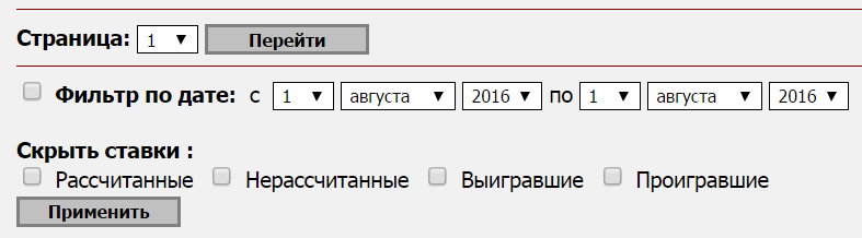 Если Вы хотите отфильтровать просматриваемые ставки, например увидеть только нерассчитанные ставки или ставки, сделанные в течение определенного периода времени, вы можете сделать это, отметив необходимые параметры внизу страницы.