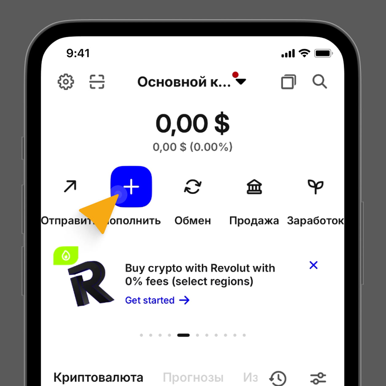 На главном экране нажмите “Пополнить” → “Купить криптовалюту”