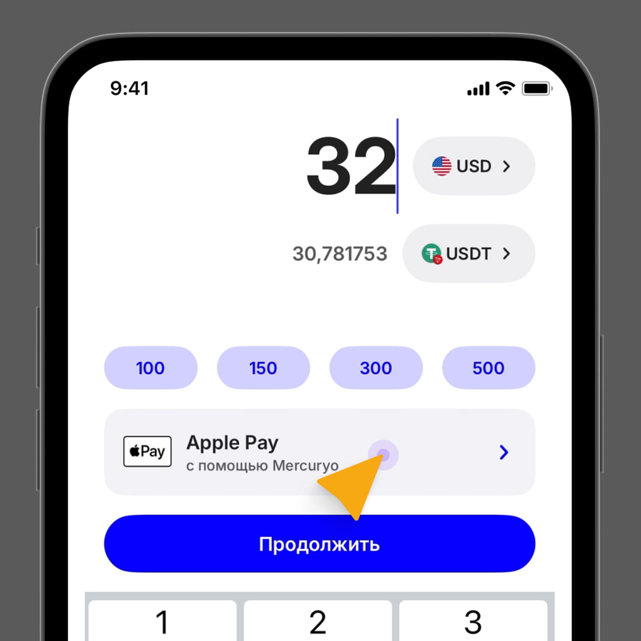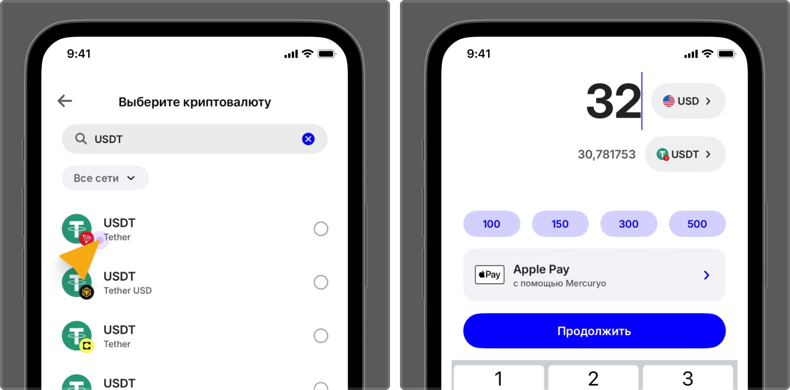 Выберите монету, например USDT (TRC-20) и укажите сумму покупки в вашей валюте.