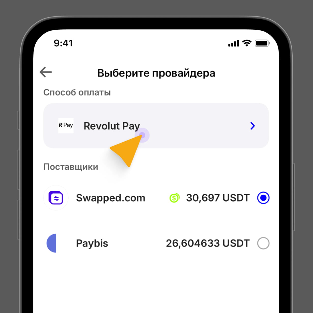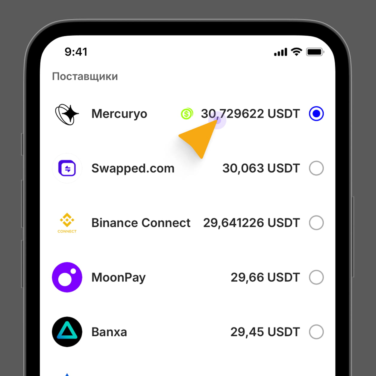 Выберите провайдера (поставщика), через которого Вы желаете приобрести USDT (TRC-20).