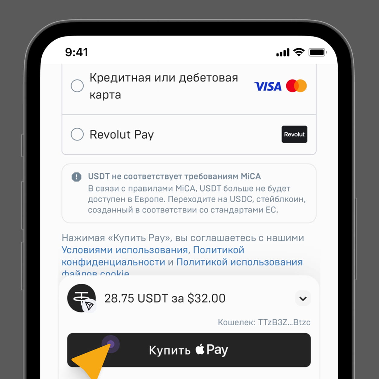 Выберите Способ оплаты (карты, Apple Pay и т.д.), через который хотите оплатить покупку.