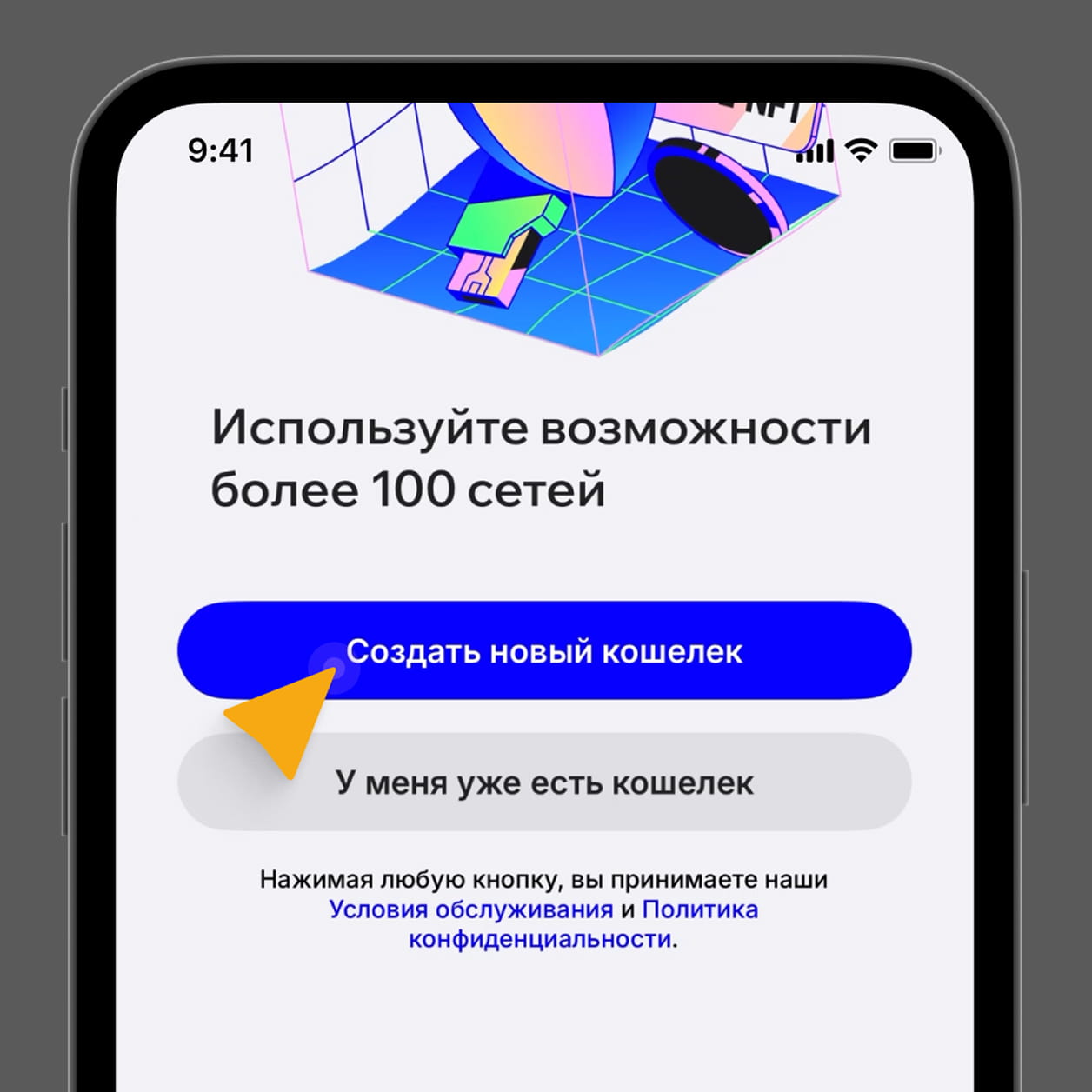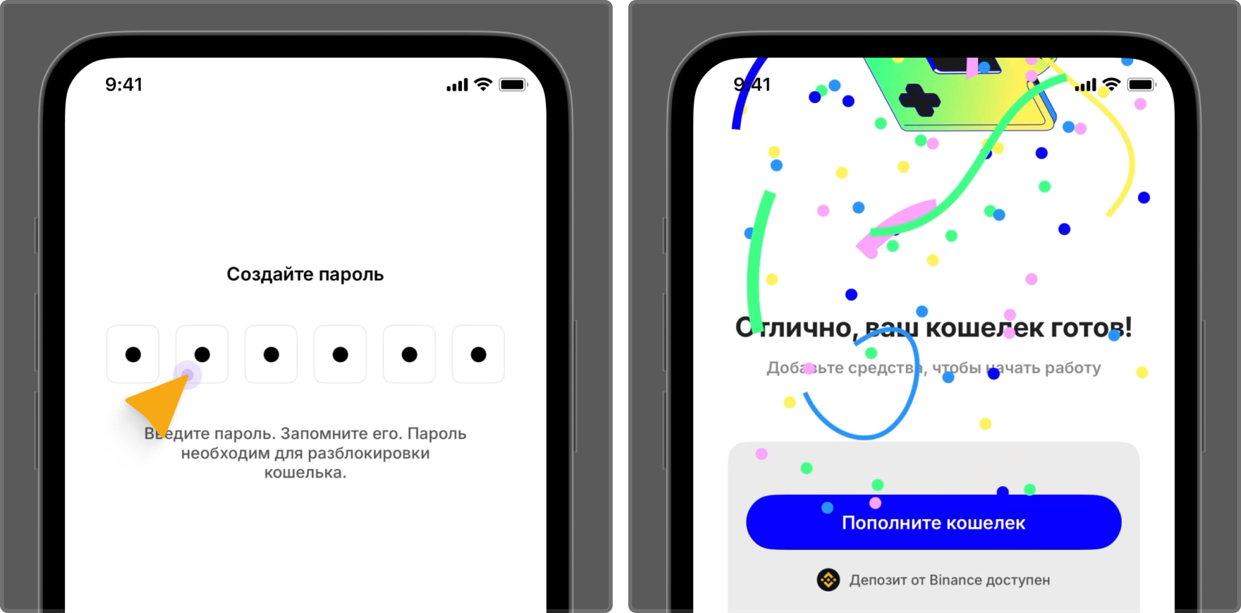 Откройте приложение → Нажмите “Создать новый кошелёк (Create New Wallet). Придумайте пароль, подтвердите его. При желании подключите FaceID.