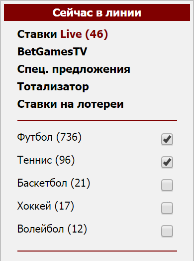 После регистрации счета и его пополнения Вы готовы сделать ставку. Для этого выберите вид спорта из списка в левой части страницы и нажмите кнопку «Показать»