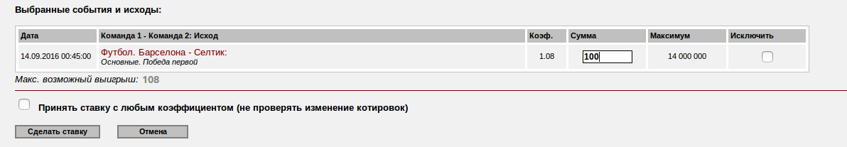 Здесь вам необходимо указать сумму, на которую вы хотите сделать ставку. Проверьте, чтобы исходы и сумма были указаны правильно, и нажмите «Сделать ставку». После того, как Ваша ставка принята, на экране появится подтверждение. В истории счета отобразится Ваша ставка. Принятые ставки не могут изменяться.