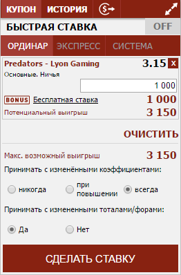 Нажмите на нее для добавления суммы ставки. После нажатия на эту кнопку сумма ставки не редактируется. Нажмите кнопку “Сделать ставку”, и Ваша бесплатная ставка будет принята. Если купон у Вас отключен - необходимо так же выбрать исход, нажать кнопку “Ставка”, и в новом окне появится возможность сделать бесплатную ставку таким же образом.