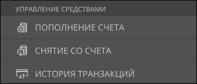 Для снятия средств со счета перейдите в раздел «Снятие со счета» в меню в подразделе «Управление средствами».