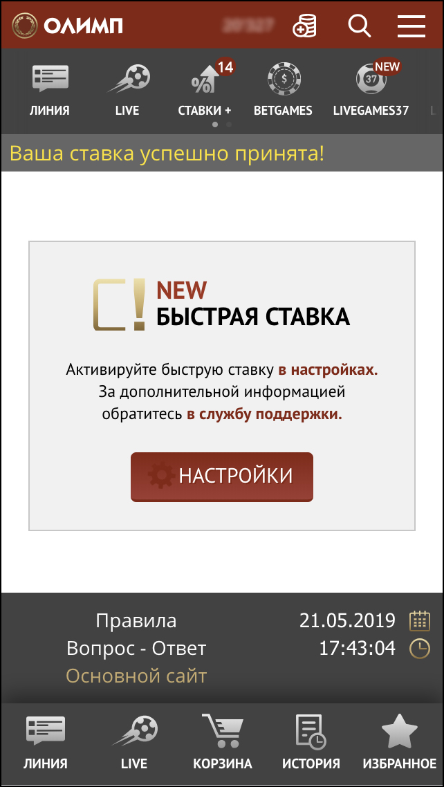 В Корзине необходимо указать сумму, на которую Вы хотите сделать ставку. Проверьте правильность исхода и суммы ставки и нажмите «Сделать ставку».