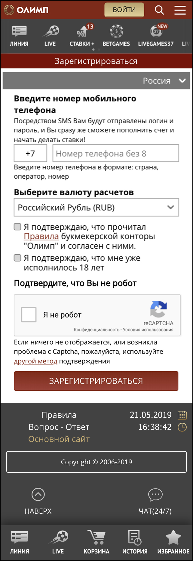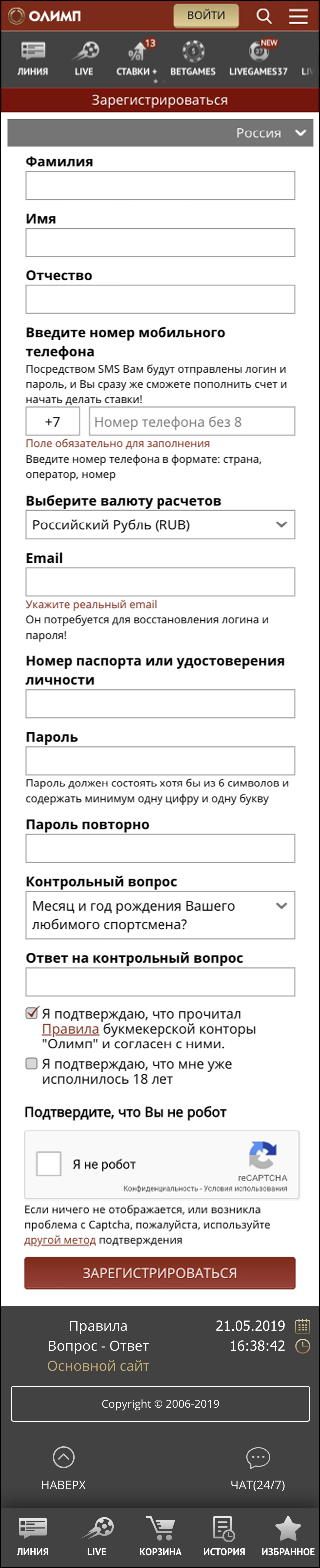 Пожалуйста, внимательно ознакомьтесь с Правилами перед заполнением регистрационной формы. Лица младше 18 лет или проживающие на территории, где запрещены азартные игры, не могут регистрировать счет в «Олимпе». Пользователь может иметь только один счет. Любая заявка на создание счета, которая не соответствует данным правилам, будет отклонена.